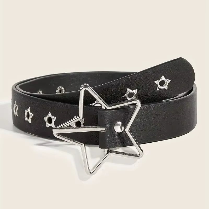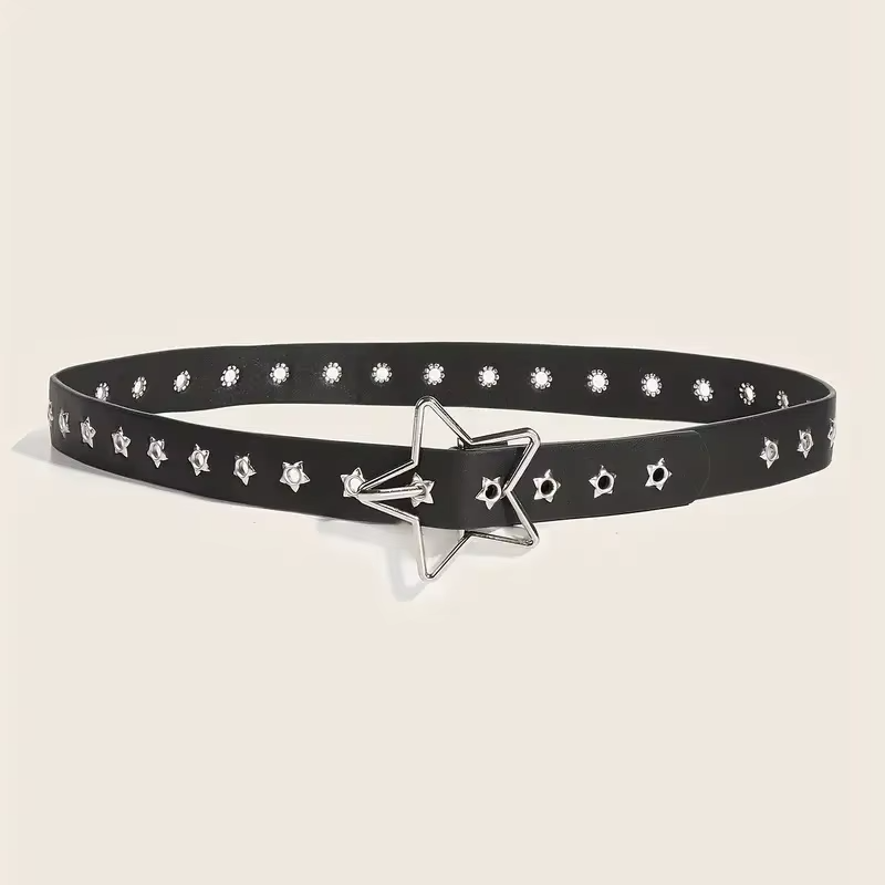Abrace o revival dos anos 2000 com ousadia! O Cinto Y2K Estrela Preto é o acessório definitivo para quem vive a vibe Punk e Goth. Feito de couro do plutônio (PU) preto, este cinto se destaca pelos detalhes em rebite e ilhó no formato de estrela, que dão um toque fashion e rebelde instantâneo.